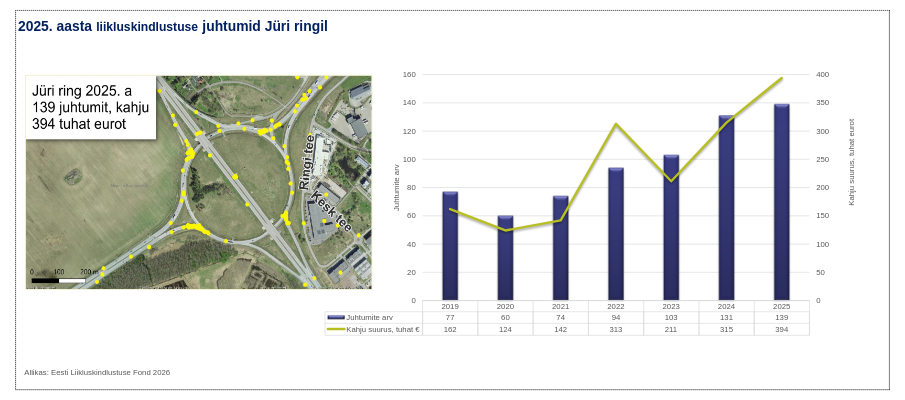 - Juhtumite rohkeim ristmik oli 2025. aastal Rae vallas Jüri ringristmikul – 139 juhtumit kogukahjuga 394 000 eurot.