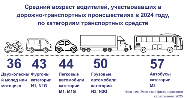 Согласно статистике Эстонского фонда дорожного страхования (LKF), средний возраст лиц, ответственных за страховые случаи, увеличивается на пять лет каждое десятилетие этого века. Если на рубеже веков большинство дорожно-транспортных происшествий происходило по вине водителей в возрасте 30+ лет, то в 2012 году средний возраст водителей, виновных в ДТП, составлял 40 лет, а с 2022 года – 45 лет.