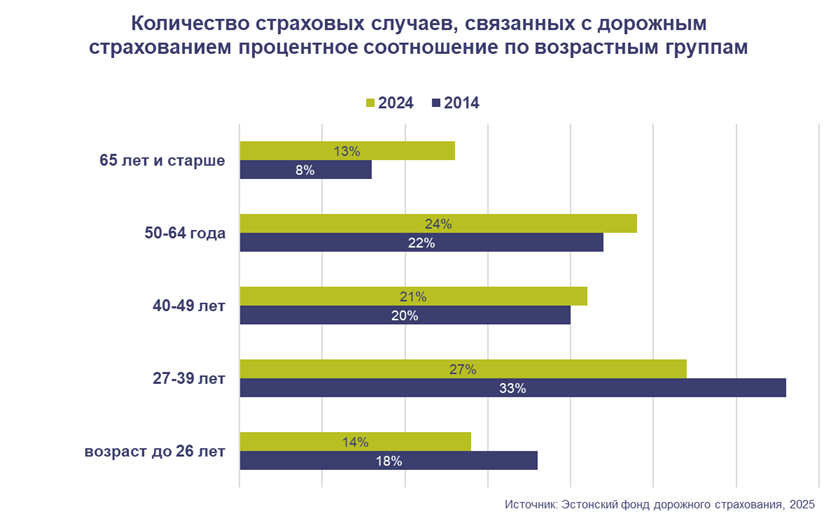 Согласно статистике Эстонского фонда дорожного страхования (LKF), средний возраст лиц, ответственных за страховые случаи, увеличивается на пять лет каждое десятилетие этого века. Если на рубеже веков большинство дорожно-транспортных происшествий происходило по вине водителей в возрасте 30+ лет, то в 2012 году средний возраст водителей, виновных в ДТП, составлял 40 лет, а с 2022 года – 45 лет.